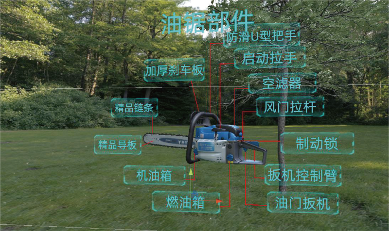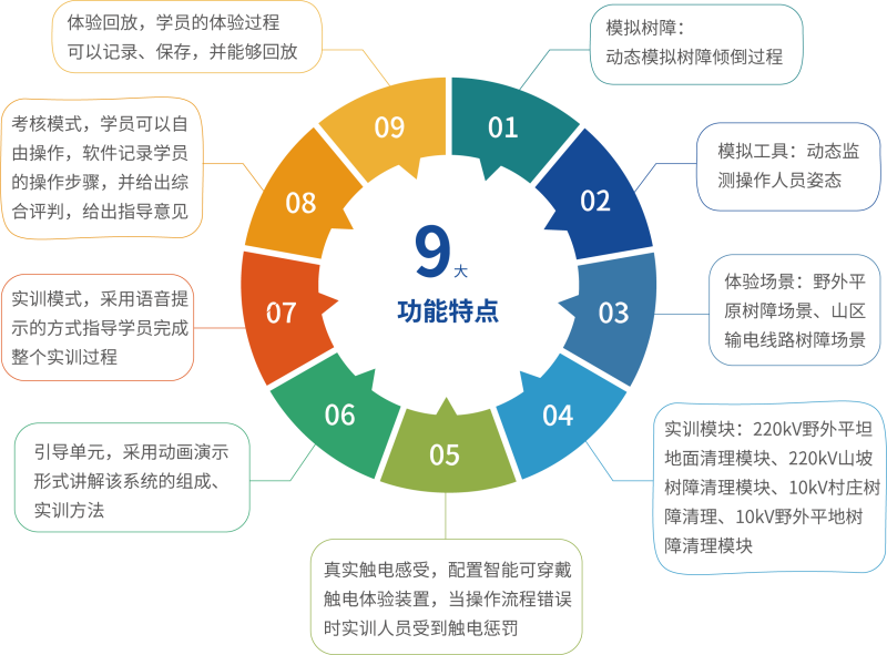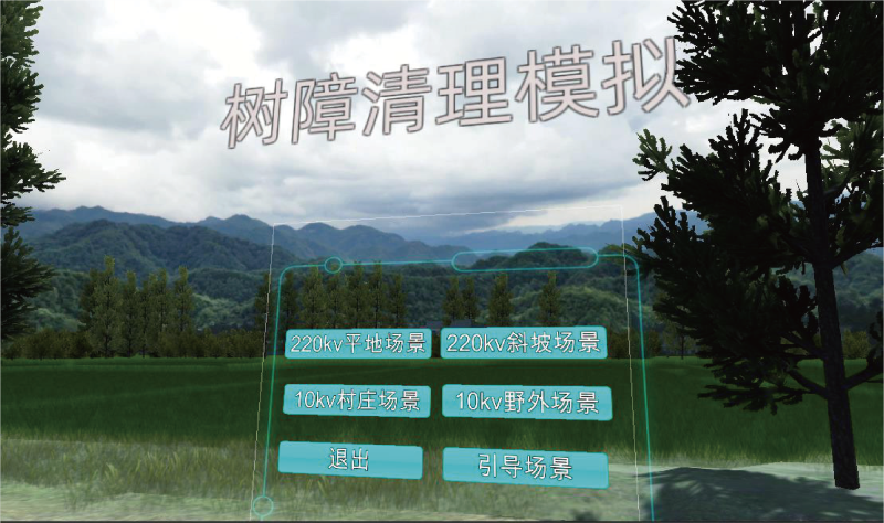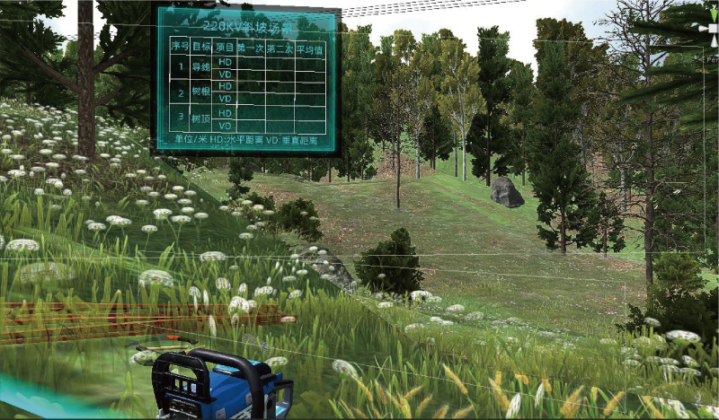 本項目在虛擬場景中搭建輸電線路環境,按照真實作業流程模擬樹障清理的整個過程,通過采用VR 互動技術 為參訓人員提供沉浸式的作業訓練環境;模擬開展真實的樹障清理工作,對實訓人員的操作情況進行監視、 記錄,通過畫面警示、聲音報警、文字提示、觸覺感知等形式,對操作行為給予實時的反饋與警示。